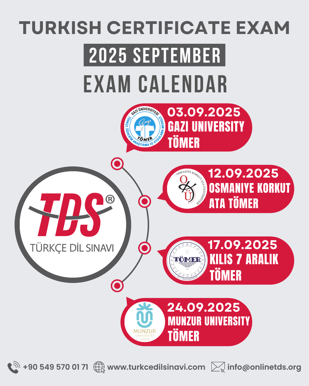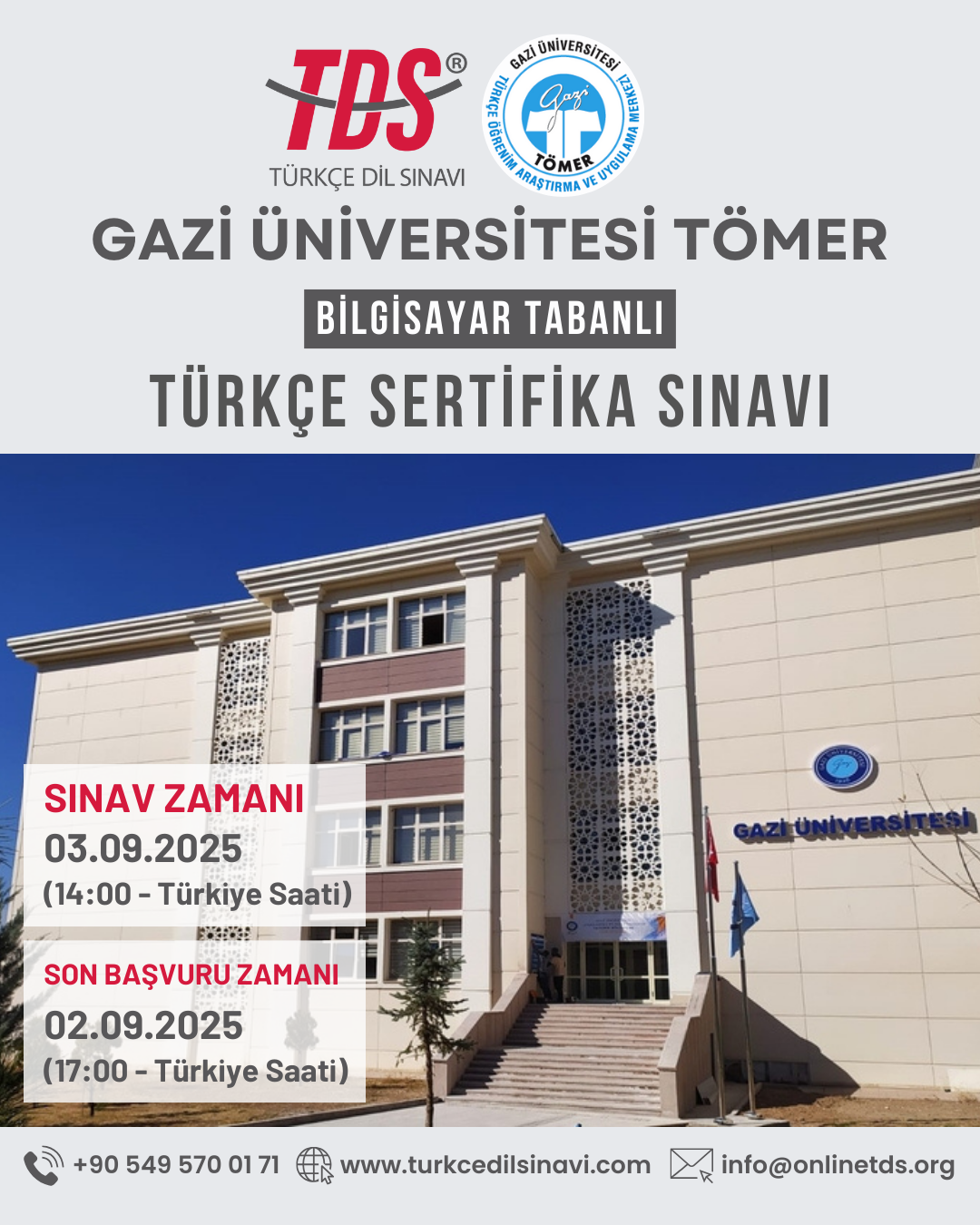 Gazi Üniversitesi TÖMER Türkçe Sertifika Sınavı (2025 Eylül) TDS® sınav sistemi ile Gazi Üniversitesi TÖMER arasında mevcut olan anlaşma kapsamında aşağıdaki bilgiler doğrultusunda T&uum...