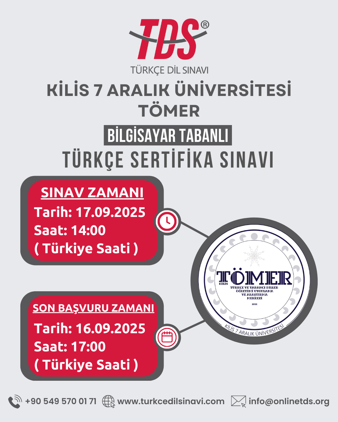 Kilis 7 Aralık Üniversitesi TÖMER Türkçe Sertifika Sınavı (2025 Eylül) TDS® sınav sistemi ile Kilis 7 Aralık Üniversitesi TÖMER arasında mevcut olan anlaşma kapsamında aşağıdaki bilgiler...