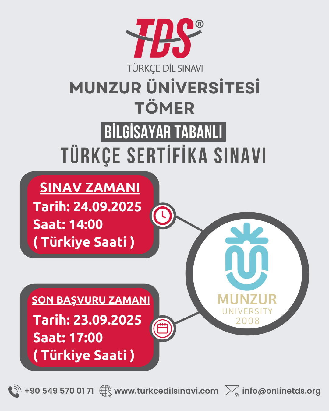 Munzur Üniversitesi TÖMER Türkçe Sertifika Sınavı (2025 Eylül) TDS® sınav sistemi ile Munzur Üniversitesi TÖMER arasında mevcut olan anlaşma kapsamında aşağıdaki bilgiler doğrultusunda T...