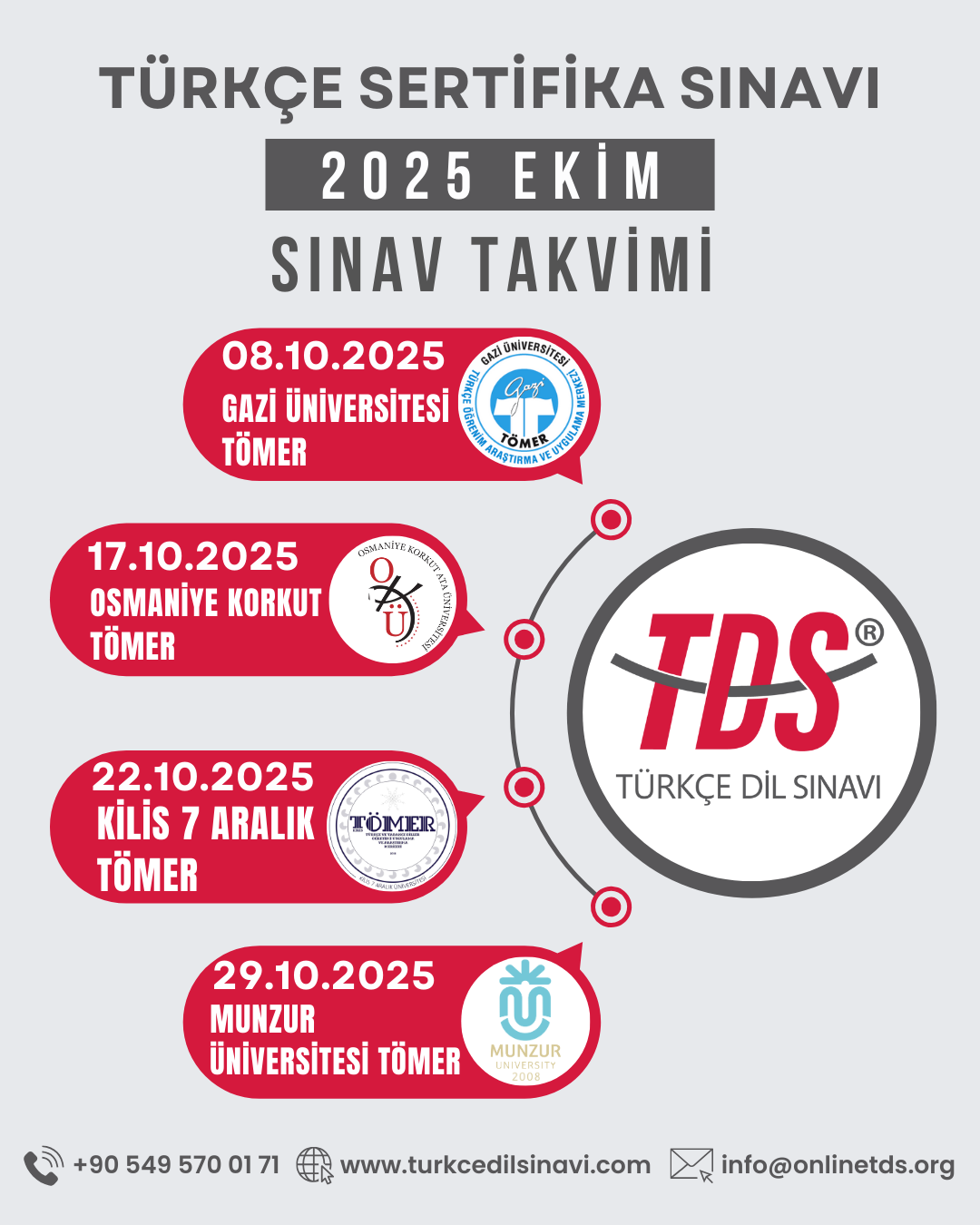 TDS® Sınav Takvimi (2025 Ekim) Kurumumuz ile devlet üniversiteleri arasında yapılan anlaşmalar doğrultusunda, 2025 Ekim ayında TDS® sınav sistemi üzerinden gerçekleştirilecek bilgisayar tabanlı Tür...