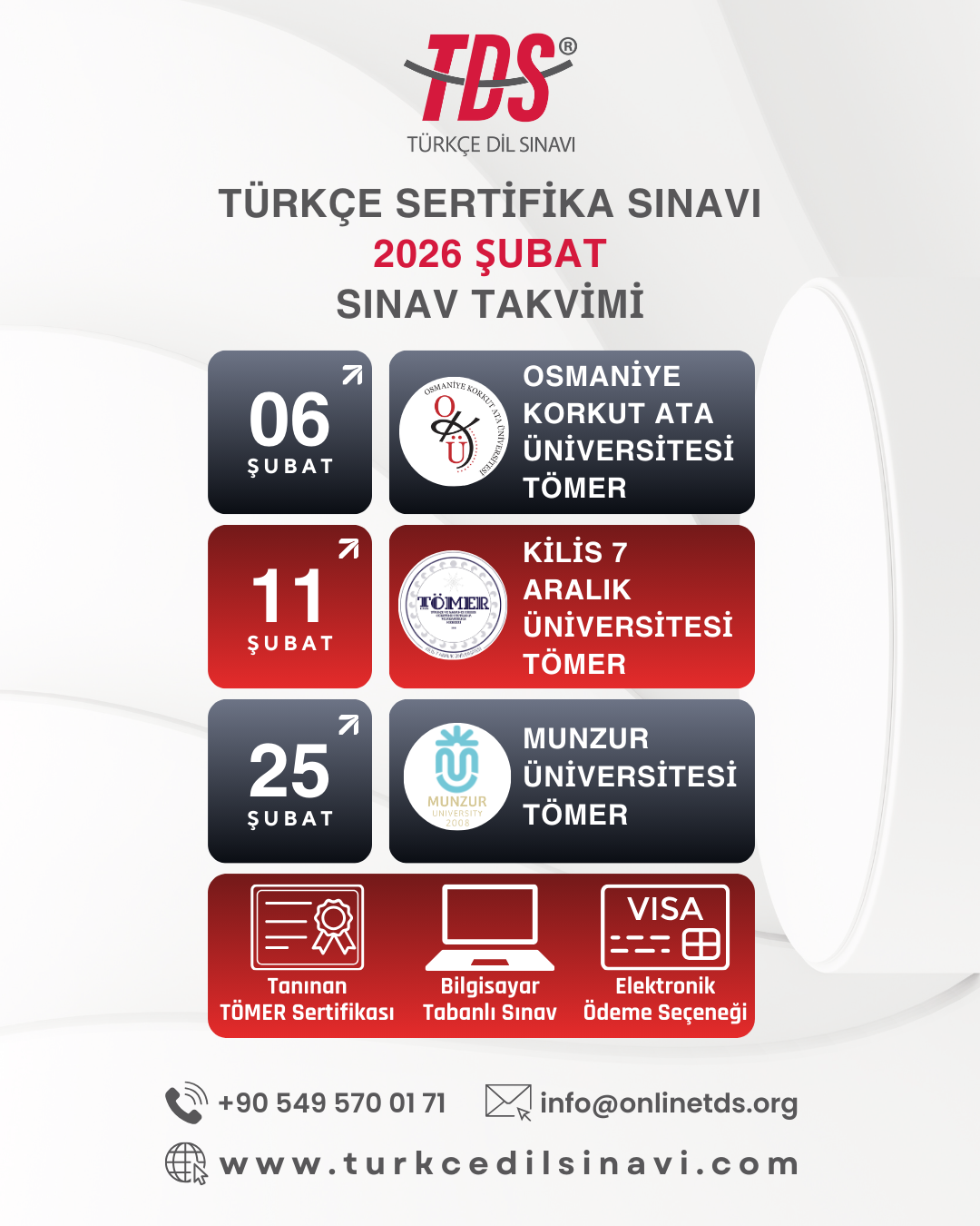 TDS® Sınav Takvimi (2026 Şubat) Kurumumuz ile devlet üniversiteleri arasında yapılan anlaşmalar doğrultusunda, 2026 Şubat ayında TDS® sınav sistemi üzerinden gerçekleştirilecek bilgisayar tabanlı Tü...